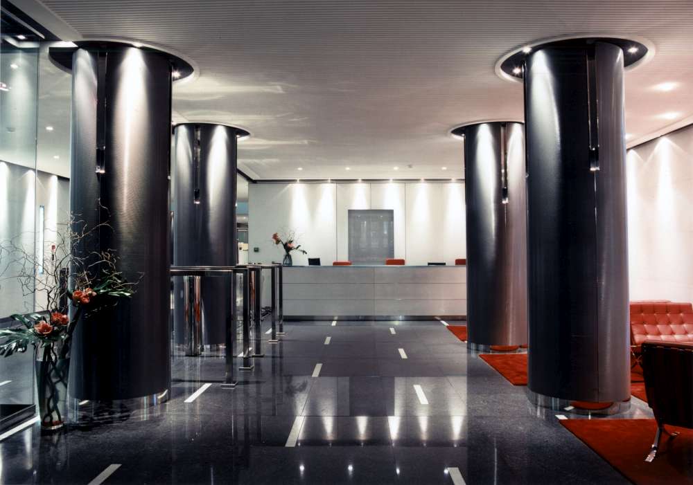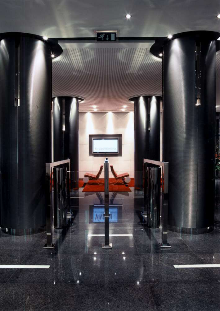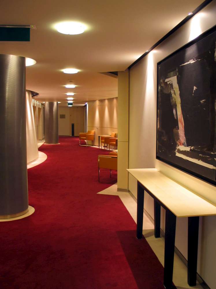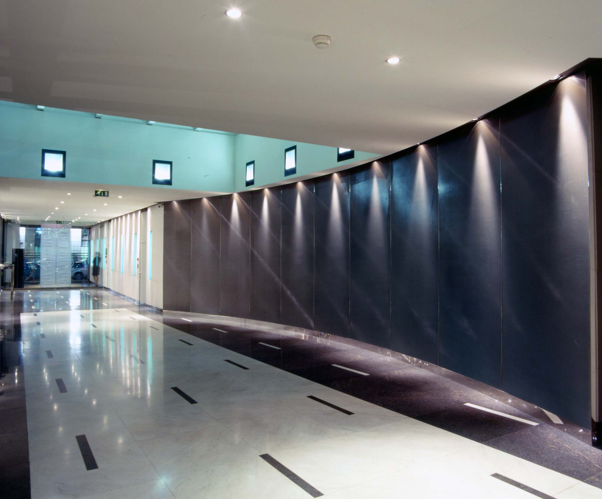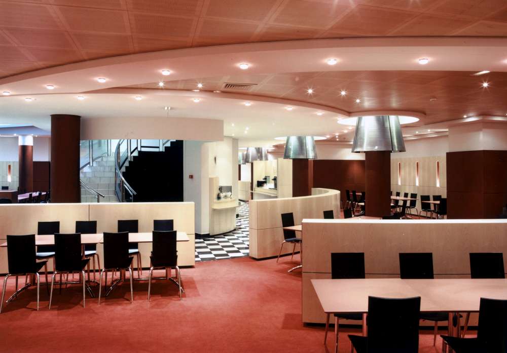Aménagement du hall d'accueil, des circulations et de la salle du conseil au rez-de-chaussée ; de la cafétéria et du restaurant d'entreprise au premier sous-sol ; d'un espace Lounge et de salles à manger privées à l'étage de direction.